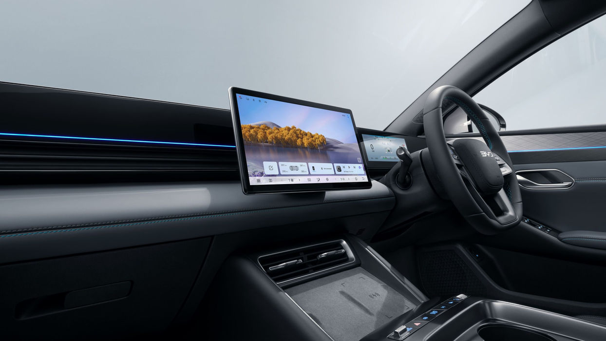 A 12.8-inch intelligent touchscreen powered by BYD’s DiLink system anchors the cabin, complemented by a digital driver display, ergonomic layout, and practical storage including a 65L frunk and 460L rear boot.
